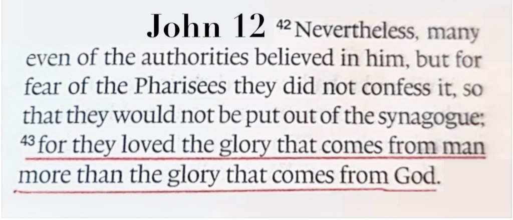 Do you care more about the glory that comes from man than the glory which comes from God? Are you a people pleaser? As Christians we submit ourselves to the Lordship of Christ within us. As Christians in this world we share the message of the cross that is naturally offensive to the unbelievers. But as the Holy Spirit motivates us to share the Gospel, though we don’t sugar-coat it, we share the joy of living a life that pleases the Lord. And He gets all the glory. Remember that in the Bible the Pharisees “loved the glory that is of men more than the glory that is of God” ~~ John 12:43.
