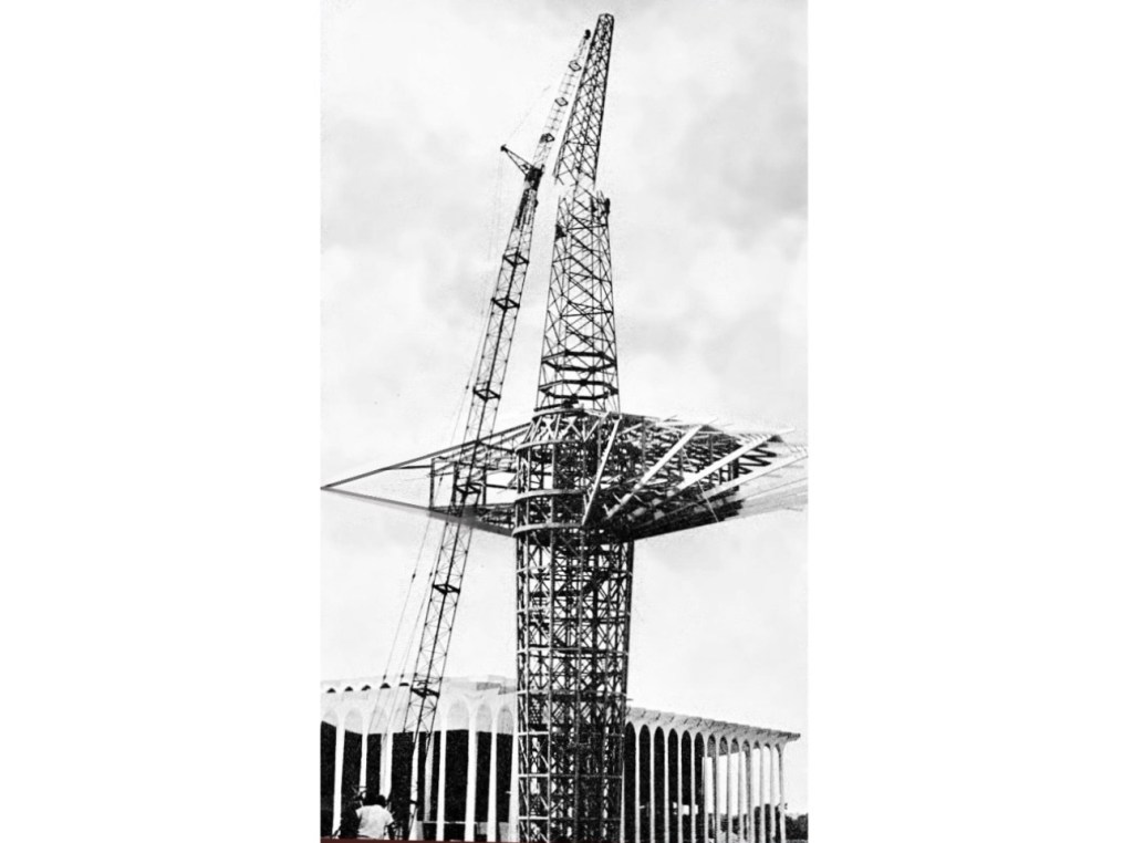 This photo is of the iconic Prayer Tower at the center of the Oral Roberts University campus in Tulsa being assembled in 1965.